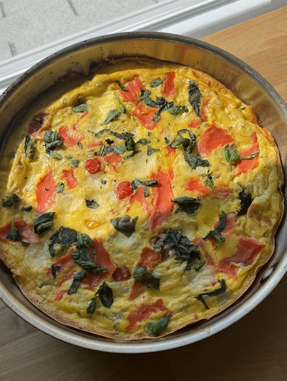 Pour the egg mixture into the skillet. Add the cherry tomatoes and half of the mozzarella evenly throughout. Let the mixture cook on the stovetop for about 8-6 minutes, until the edges are set and the center is beginning to firm up.