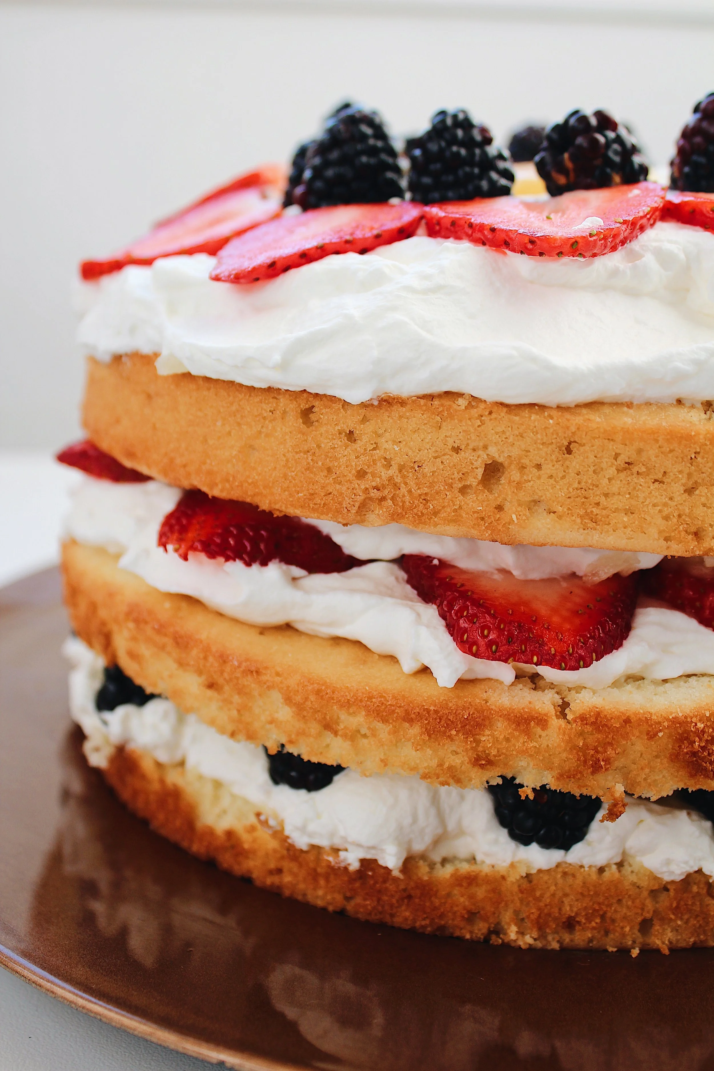 To assemble, place one of the cooled layers on a cake plate. Using a pastry brush, soak the layer with the pineapple juice. Add a ½ cup of the frosting, roughly spread and top with a ½ cup of the berries and pineapples. Repeat until the last layer. For the top, add the remaining frosting and decorate with berries.